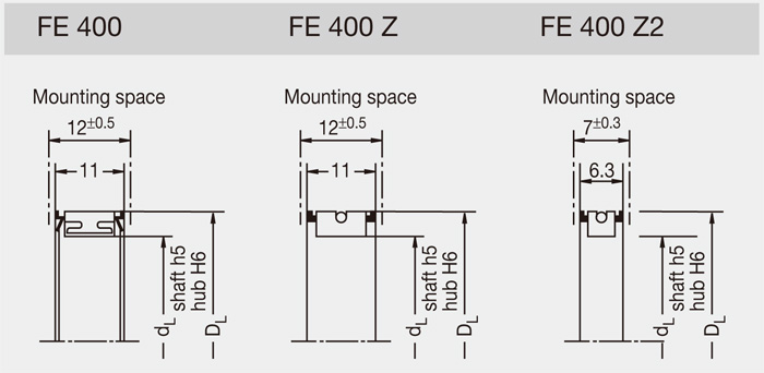 | Dimensions[mm] | FE 400 | FE 400 Z | FE 400 Z2 | Idling speed Clutch nmax[RPM] | Dimensions [inch] | ||||||||